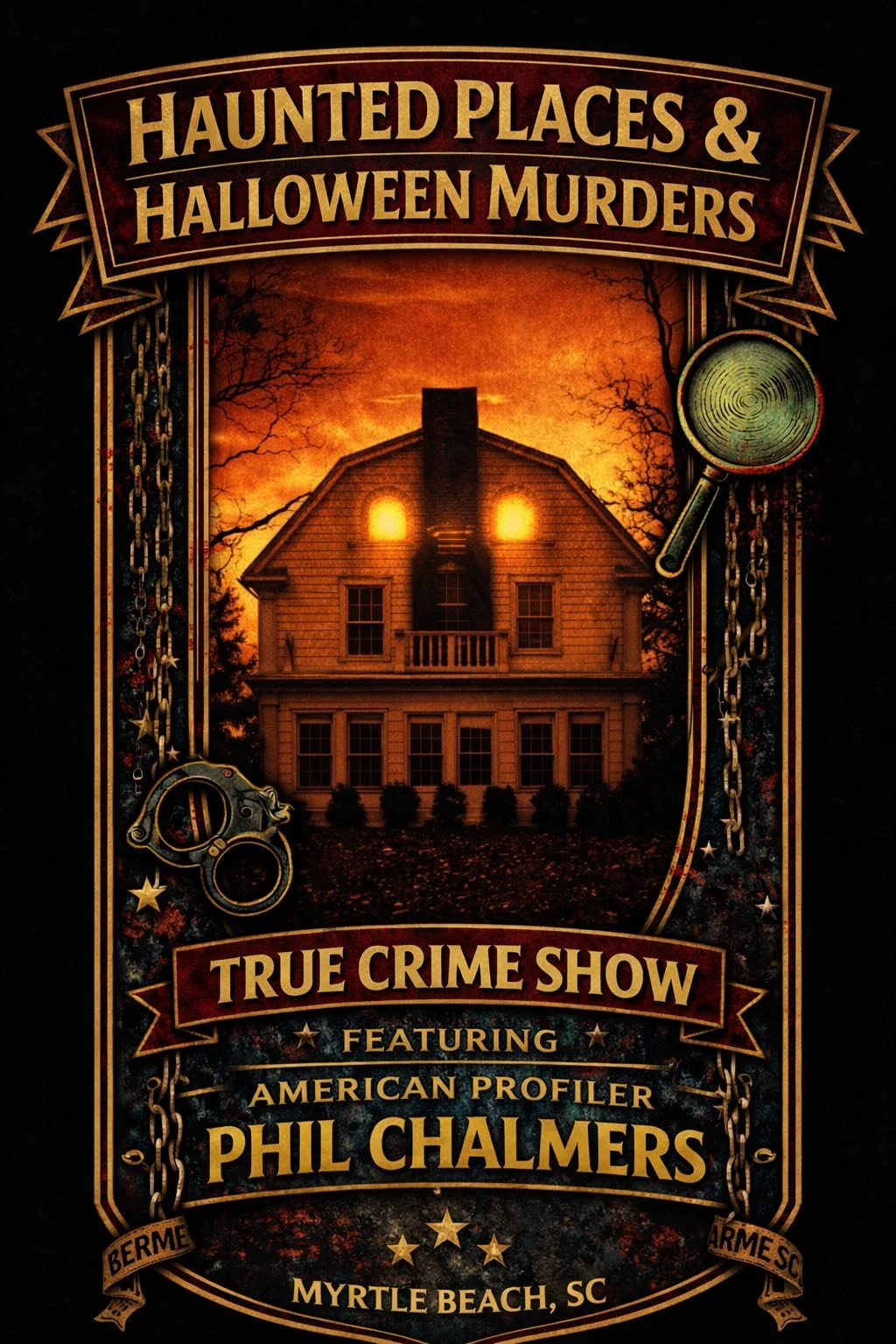 “Haunted Places & Halloween Murders” On this spooky night we will take a deep dive into famous murder cases that took place on Halloween Night. We will also dive into some haunted places and haunted artifacts. You might even get to handle a haunted item or two. Hosted by American Profiler Phil Chalmers